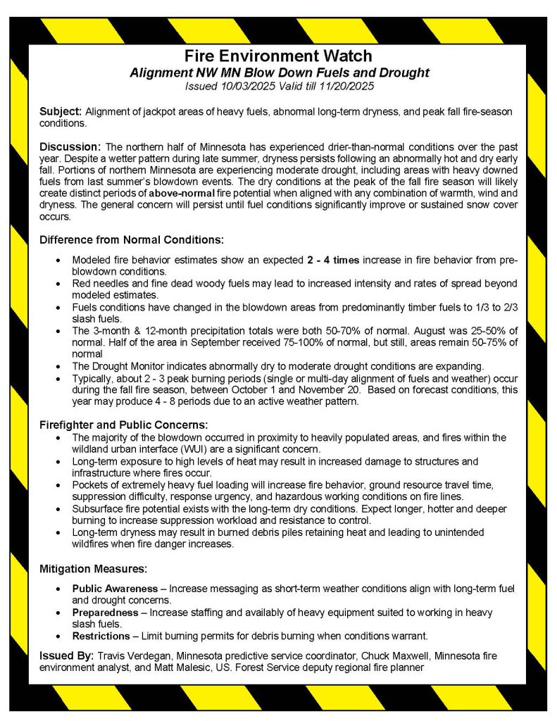 A Fire Environment Watch has been issued for areas impacted by the June blowdown in Northwest Minnesota.